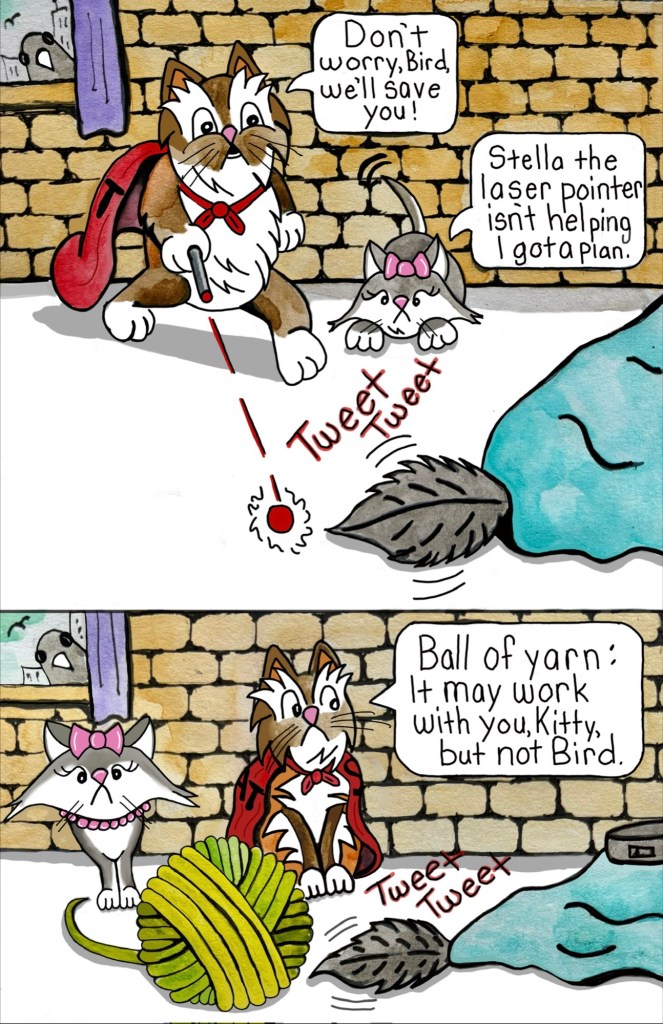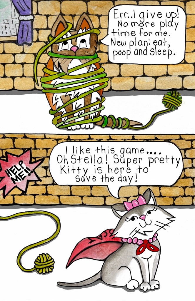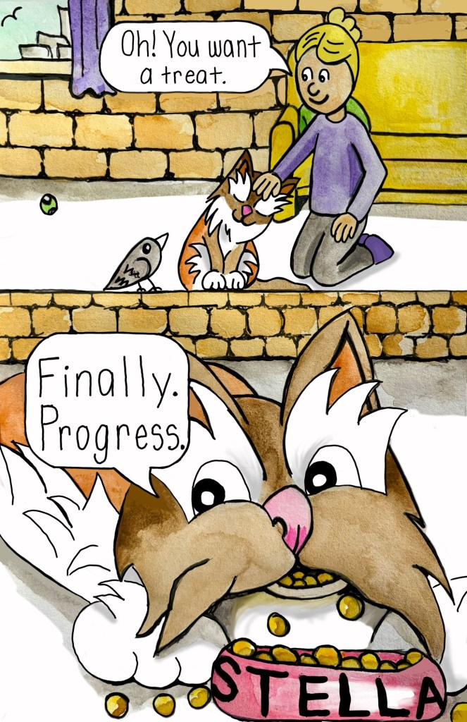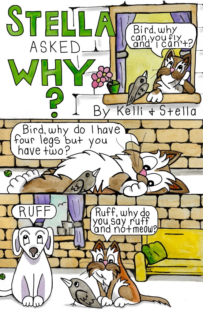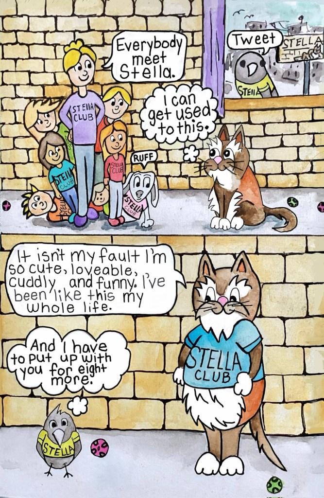Now Stella spends her days exploring the high life in a big city: napping in sunbeams, judging pedestrians from a windowsill with her best friend Bird, and occasionally knocking over something very breakable and blaming the pretty kitty next door. She loves sharing her adventures, like the time she explored the scary hallway just to prove to her friends that the legend of the Hallway Monster was true. Was it true or just another silly story or both? Every day is an adventure… especially if Stella’s involved.